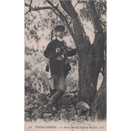 TYPE CORSE - LE JEUNE BANDIT DANS LE MAQUIS - CARTE AVEC TEXTE DATEE DE 1908.