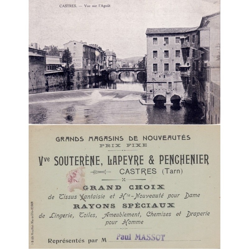 CASTRES - VUE SUR L'AGOUT - VERSO REPIQUAGE PUBLICITAIRE GRANDS MAGASINS DE NOUVEAUTES - Vve SOUTERENE, LAPEYRE & PENCHENIER.