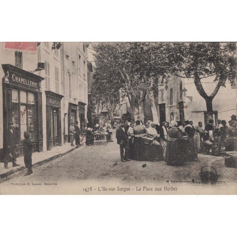 • L'ISLE SUR SORGUE - LA PLACE AUX HERBES - ANIMATION - LE MARCHE - CARTE DATEE DE 1908.