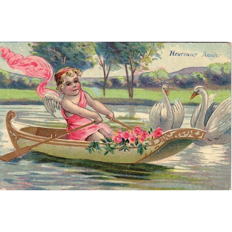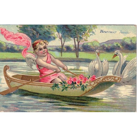 BONNE ANNEE - CARTE GAUFREE - ILLUSTRATION ANGE DANS UNE BARQUE.