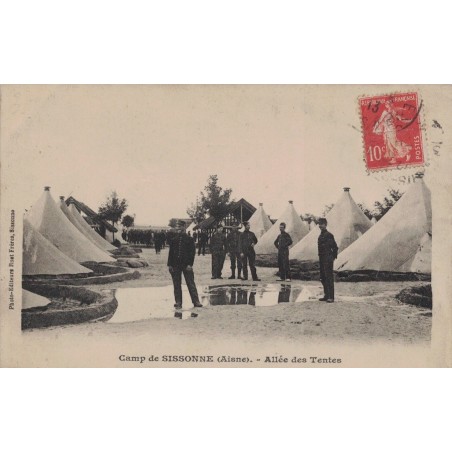 CAMP DE SISSONNE - ALLEE DE TENTES - ANIMATION - CARTE DATEE DE 1915.
