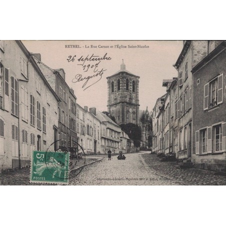 • RETHEL - LA RUE CARNOT ET L'EGLISE SAINT-NICOLAS - CARTE DATEE DE 1907.