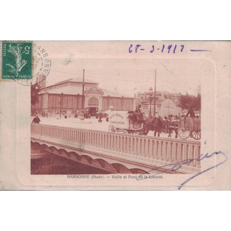 NARBONNE - HALLE DU PONT DE LA LIBERTE - ATTELAGE AVEC REMORQUE GLACIERE NARBONNAISE L.GABARROU ET FILS - CARTE DATEE DE 1912.