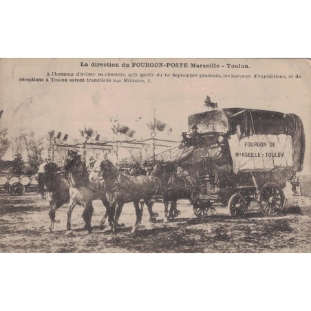 MARSEILLE - FOURGON-POSTE DE MARSEILLE A TOULON - ATTELAGE - CARTE DATEE DE 1904 - LA DIRECTION A L'HONNEUR D'AVISER SA CLIENTELE .DU CHANGEMENT D'ADRESSE LES BUREAUX SERONT TRANSFERES RUE MILITAIRE A TOULON - PEU COURANT - EDITEE A MARSEILLE