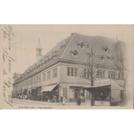 • MONTBELIARD - PLACE DENFERT - COMMERCES - CARTE AVEC TEXTE.