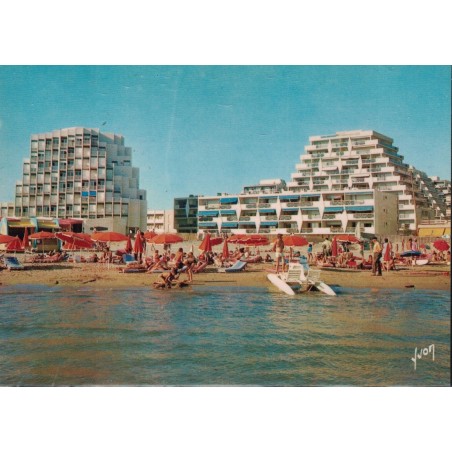 • LA GRANDE MOTTE - LA PLAGE ET LES IMMEUBLES PYRAMIDAUX - NON CIRCULEE.