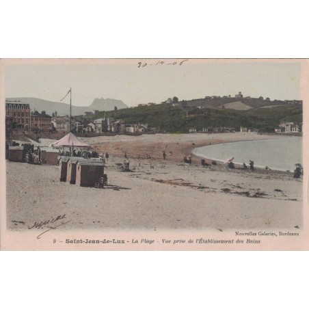 SAINT JEAN DE LUZ - LA PLAGE - VUE PRISE DE L'ETABLISSEMENT DES BAINS - COLORISEE - CARTE DATEE DE 1906.