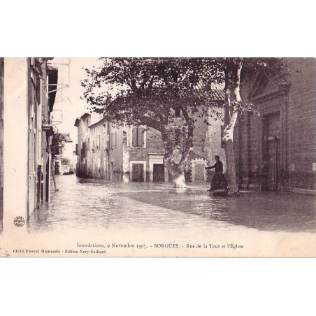 • SORGUES - INONDATIONS DU 9 NOVEMBRE 1907 - RUE DE LA TOUR ET L'EGLISE.
