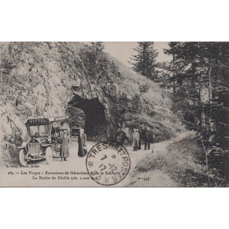 GERARDMER - LA ROCHE DU DIABLE - ANIMATION - VOITURE AVEC PUB VITTEL - CARTE DATEE DE 1917.