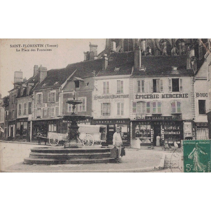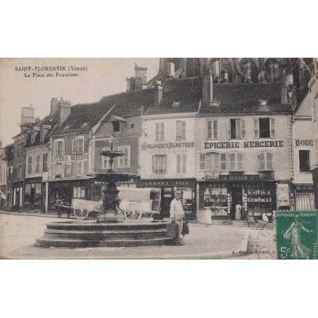 SAINT FLORENTIN - LA PLACE DES FONTAINES - COMMERCES ET ANIMATION - PLIURE D'ANGLE - CARTE DATEE DE 1910.