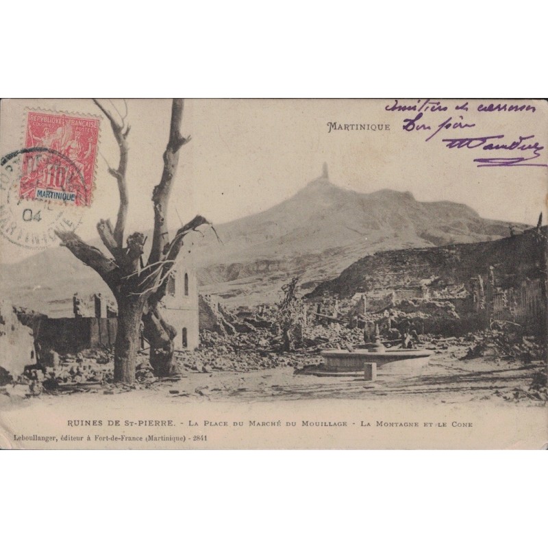 MARTINIQUE - RUINES DE ST-PIERRE - LA PLACE DU MARCHE DU MOUILLAGE - LA MONTAGNE ET LE CONE - CARTE DATEE DE 1904.