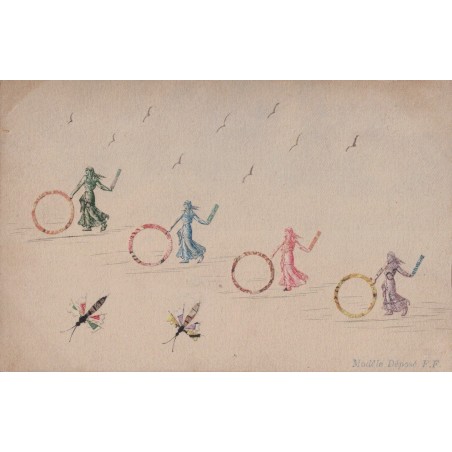 • COLLAGE - ILLUSTRATION SEMEUSE - DECOUPE DE TIMBRE - ANNOTATION MANUSCRITE  "Je découvre les Semeuses" - AVEC TEXTE.