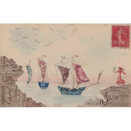 COLLAGE - ILLUSTRATION AVEC DECOUPE DE TIMBRE - LES NAVIRE DANS LA RADE - CARTE DATEE DU 27-3-1910 - ON REMARQUE LA CÔTE AVEC DES TIMBRES FISCAUX.