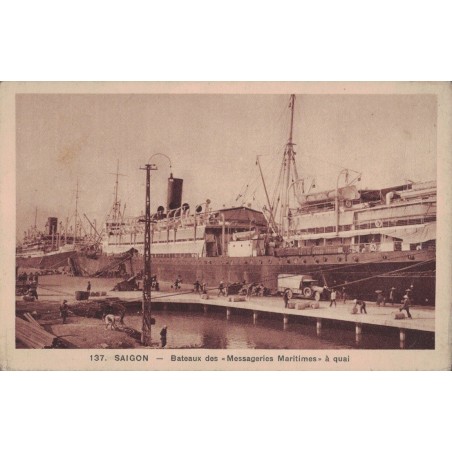 SAIGON - BATEAUX DES MESSAGERIES MARITIMES A QUAI - CARTE NON CIRCULEE.